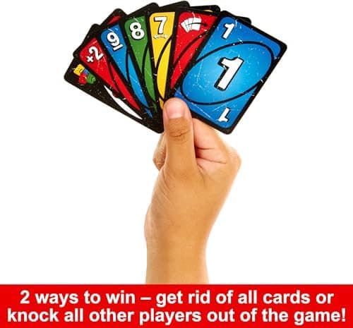 UNO Show ’em No Mercy game adds 56 more cards, special rules and super-tough action cards for the most brutal edition of UNO ever! Tougher action cards, such as Skip Everyone, Wild Draw 6 and even Wild Draw 10 make game play merciless! The Stacking Rule lets players pass the penalty (Draw +2, +4, +6, +10) to the next player until whoever can’t play has to take all the cards combined! Whenever a ‘7’ or a ‘0’ card is played, players must swap hands with another player! The Mercy Rule means that if any player gets 25+ cards in their hand, they are out of the game! More cards mean more chances to show opponents absolutely no mercy! Makes a great toy to amp up the action on friends and family game nights, travels and parties!