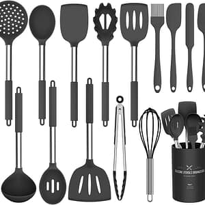 10 reviews for Silicone Cooking Utensils Set – 446°F Heat Resistant Silicone Kitchen Utensils for Cooking,Kitchen Utensil Spatula Set w Wooden Handles and Holder, BPA FREE Gadgets for Non-Stick Cookware (Khaki)