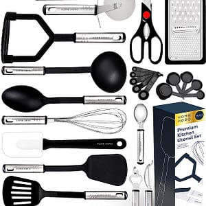 Overall this set is really nice. It looks good on my counter! It is a tight squeeze in the container that’s provided which is a little annoying. When I wash them especially in the dishwasher, the utensils then have water marks on them which is unattractive and have to clean them more. They are a bit smaller than I expected.