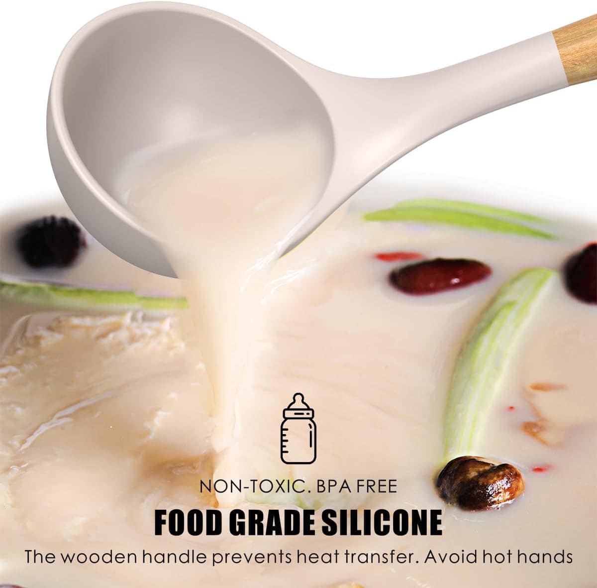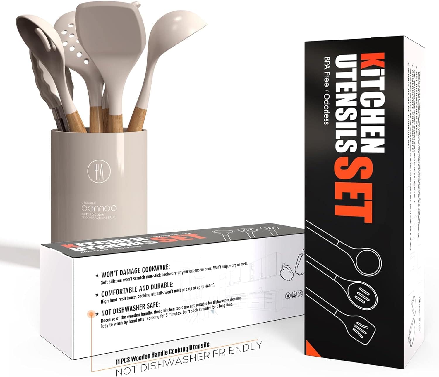 I purchased this set in Khaki .The wood handle is smooth and comfortable to hold. I would not place these in a dish washer as it messes with the integrity of handle, I recommend hand wash. The silicone utensils part are thick, and sturdy. They stir, flip and serve food well. The silicone whisk did start to peel its silicone layer, after 2 uses and 2 hand washes and the plastic utensils holder is not sturdy enough to hold utensils, as it tips over easily. For this reason I knocked of 1 star. But I’m over all happy with the performance of this set.