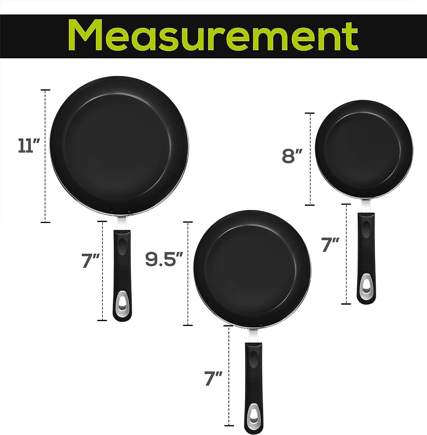 I like these. They have a nice weight to them. They were all larger than I expected. I used once to make fritters and they came out great. The heat distributes evenly. The handle doesn’t get hot. I’ll update my review after using it some more.